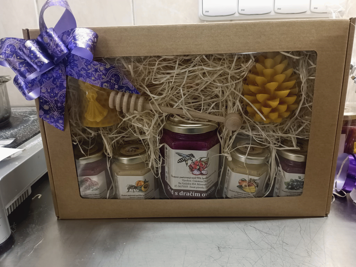 Balení obsahuje ochucený med s dračím ovocem (balení 350 g), ochucený med s meruňkou (balení 150 g), ochucený med s malinou (balení 150 g), ochucený med s mangem (balení 150 g) a ochucený med s černým rybízem (balení 150 g). K tomu navíc získáte dvě medové svíčky, které sami vyrábíme a dřevěnou naběračku na med. To vše v krásném dárkovém balení.