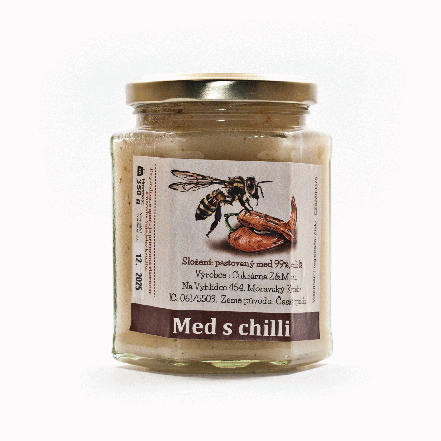 Náš úžasný med a chilli papričky. Med s chilli je vyroben 100% z přírodních prodůktů. Obsahuje 99% pastovaného medu a 1% mletých chilli papriček.