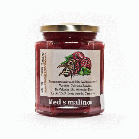 Náš med s malinami je vyroben 100% z přírodních produktů. Obsahuje 95% pastovaného medu a 5% lyofili...