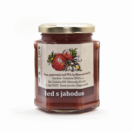 Med s jahodou je vyroben 100% z přírodních produktů. Obsahuje 95% pastovaného medu a 5% lyofilizovan...