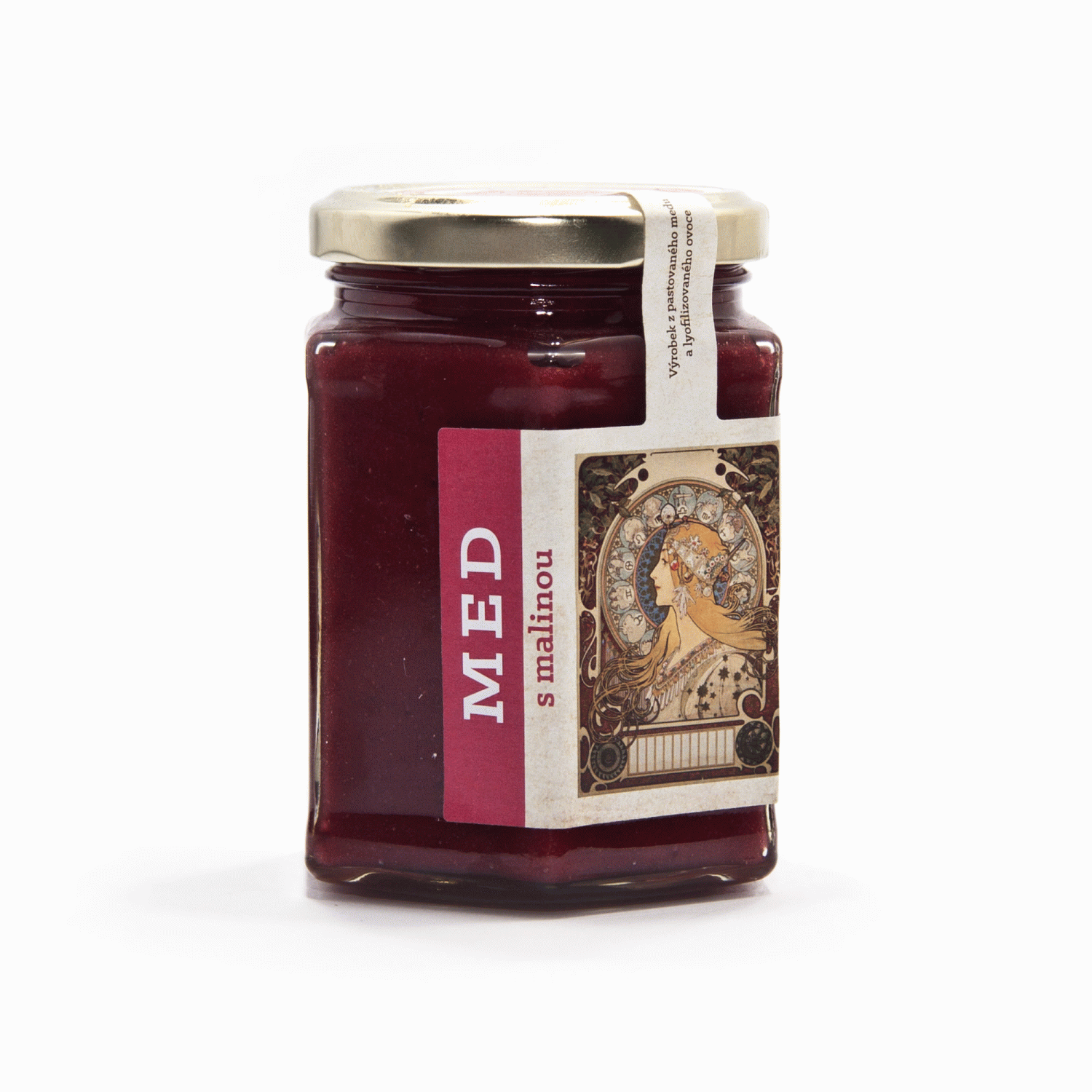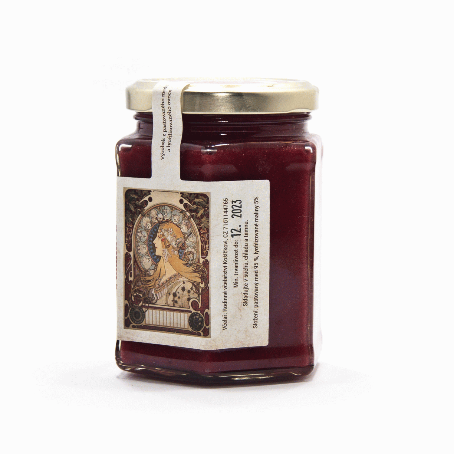 Maliny jsou bohaté na vitamín C, vlákninu a antioxidanty, které podporují imunitní systém a chrání buňky před poškozením. Obsahují také vitamín K a mangan, které přispívají ke zdraví kostí a metabolismu. Náš med s malinami je vyroben 100% z přírodních produktů. Obsahuje 95% pastovaného medu a 5% lyofilizovaných malin. Sytě červená barva a navinulá chuť malin doplněná sladkostí medu. Díky ovoci med zhoustne, ale zůstává dobře roztíratelný. Limitovaná edice na motivy obrazů malíře Alfonse Muchy.