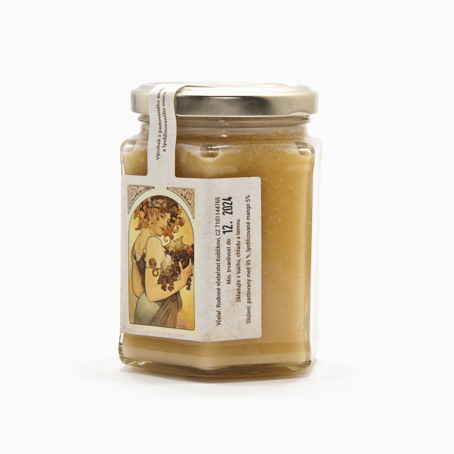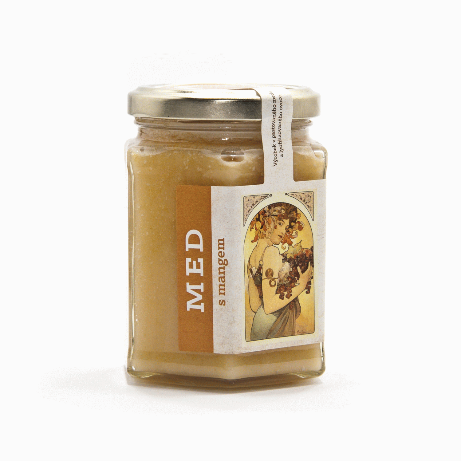 Mango je plné vitamínu C a vitamínu A, které podporují imunitu, zdraví pokožky a zraku. Také obsahuje vlákninu a antioxidanty, které pomáhají trávení a chrání buňky před volnými radikály. Med s mangem je vyroben 100% z přírodních produktů. Obsahuje 95% pastovaného medu a 5% lyofilizovaného manga. Příjemná chuť a vůně manga doplňuje chuť medu. Díky ovoci med zhoustne, ale zůstává dobře roztíratelný. Limitovaná edice na motivy obrazů malíře Alfonse Muchy.