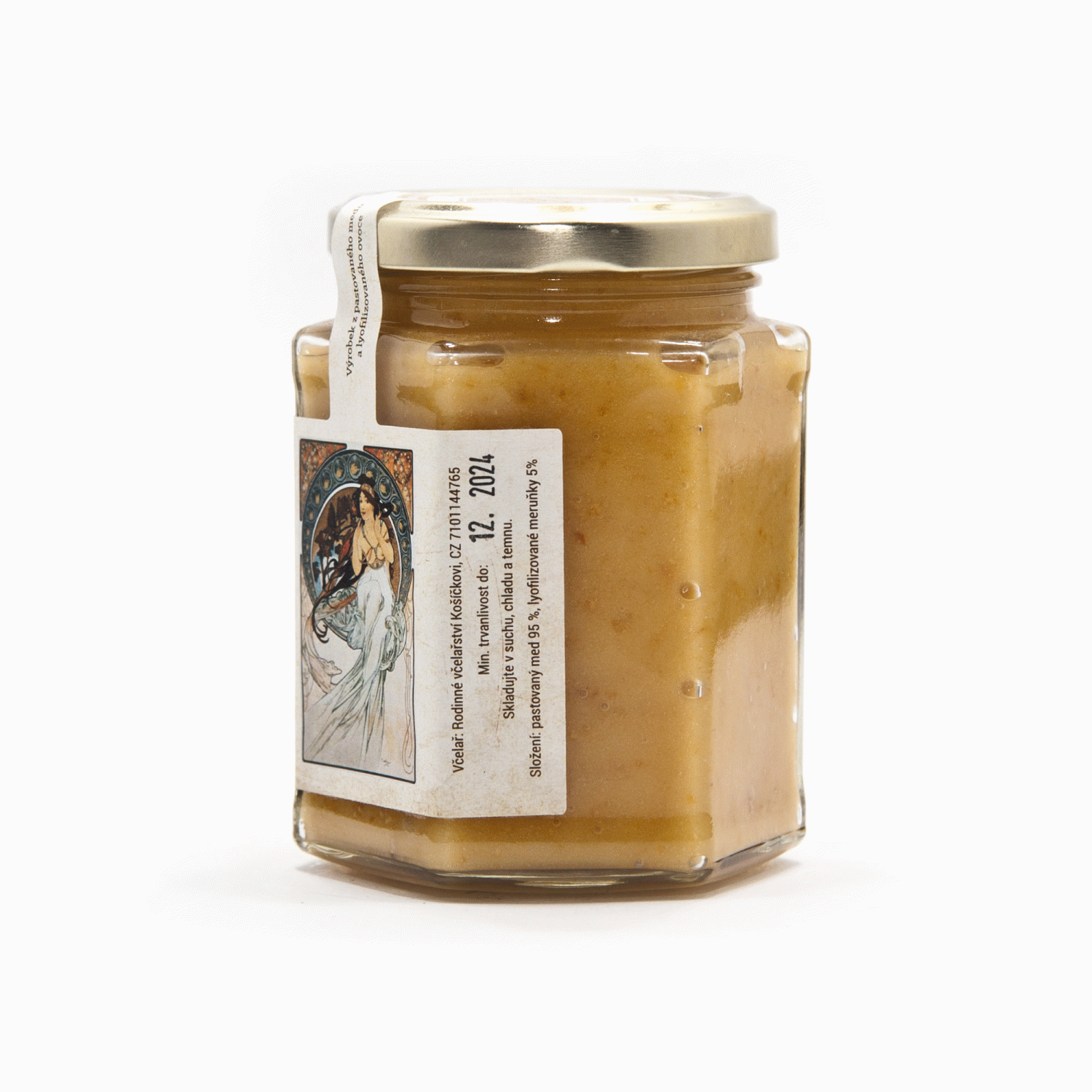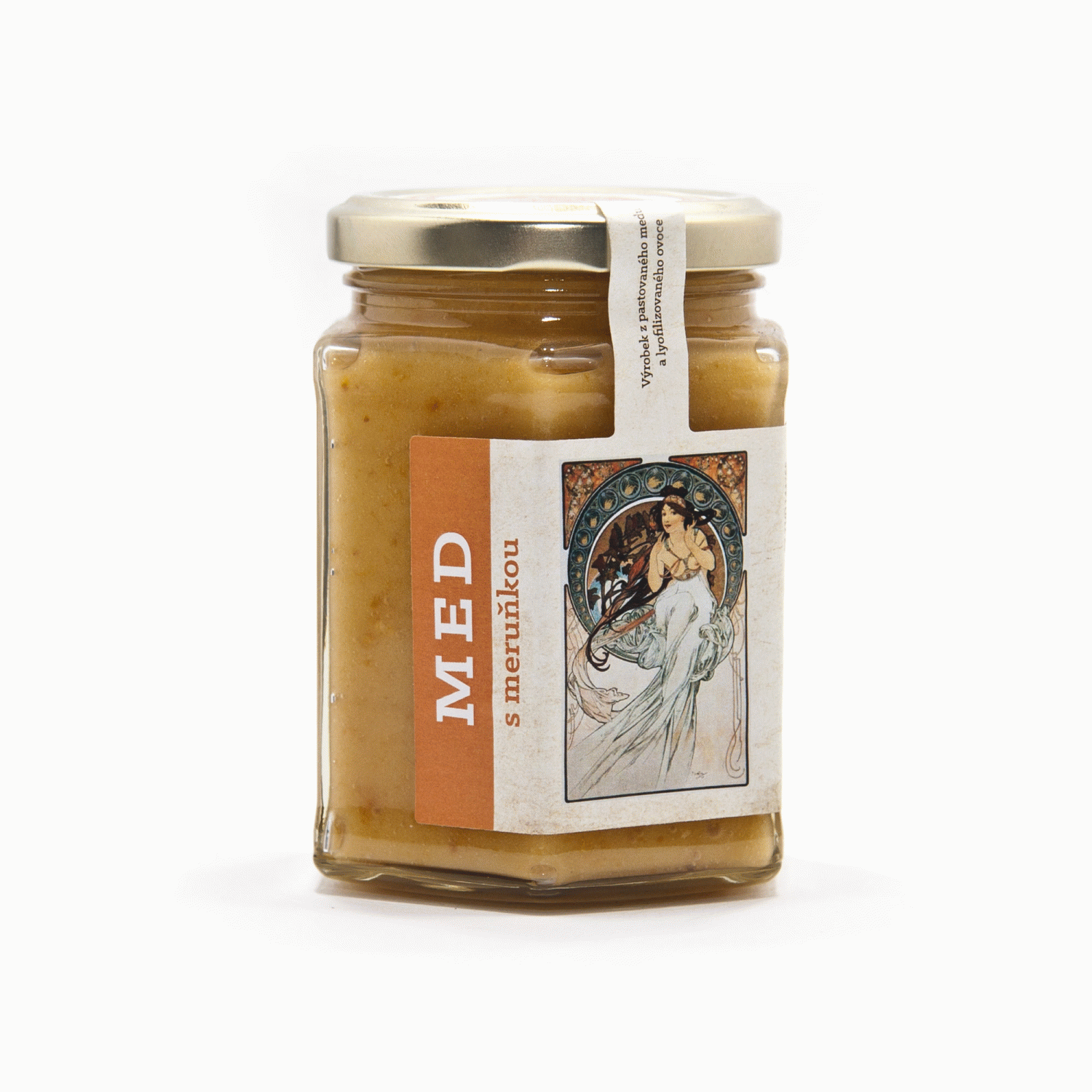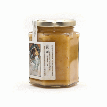 Meruňky jsou skvělým zdrojem vitamínu A a C, které podporují imunitu, zdraví očí a pokožky. Obsahují také důležité minerály jako draslík a hořčík, které přispívají ke správné funkci srdce a nervů. Díky vysokému obsahu antioxidantů a vlákniny pomáhají chránit tělo před volnými radikály a podporují zdravé trávení. Navíc jsou nízkokalorické a obsahují vysoký podíl vody, takže skvěle hydratují a hodí se do zdravého jídelníčku. Náš med s meruňkou je vyroben 100% z přírodních produktů. Obsahuje 95% pastovaného medu a 5% lyofilizovaného meruňky. Příjemná chuť a vůně meruňky doplňuje chuť medu. Díky ovoci med zhoustne, ale zůstává dobře roztíratelný. Limitovaná edice na motivy obrazů malíře Alfonse Muchy.