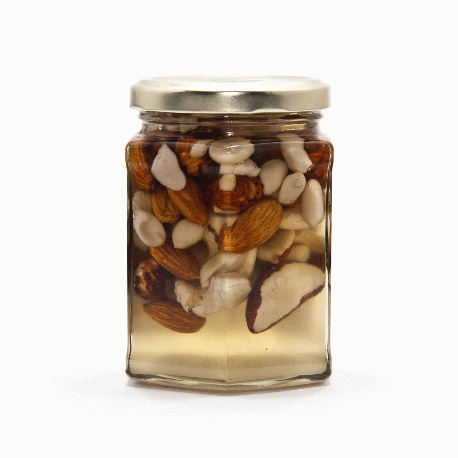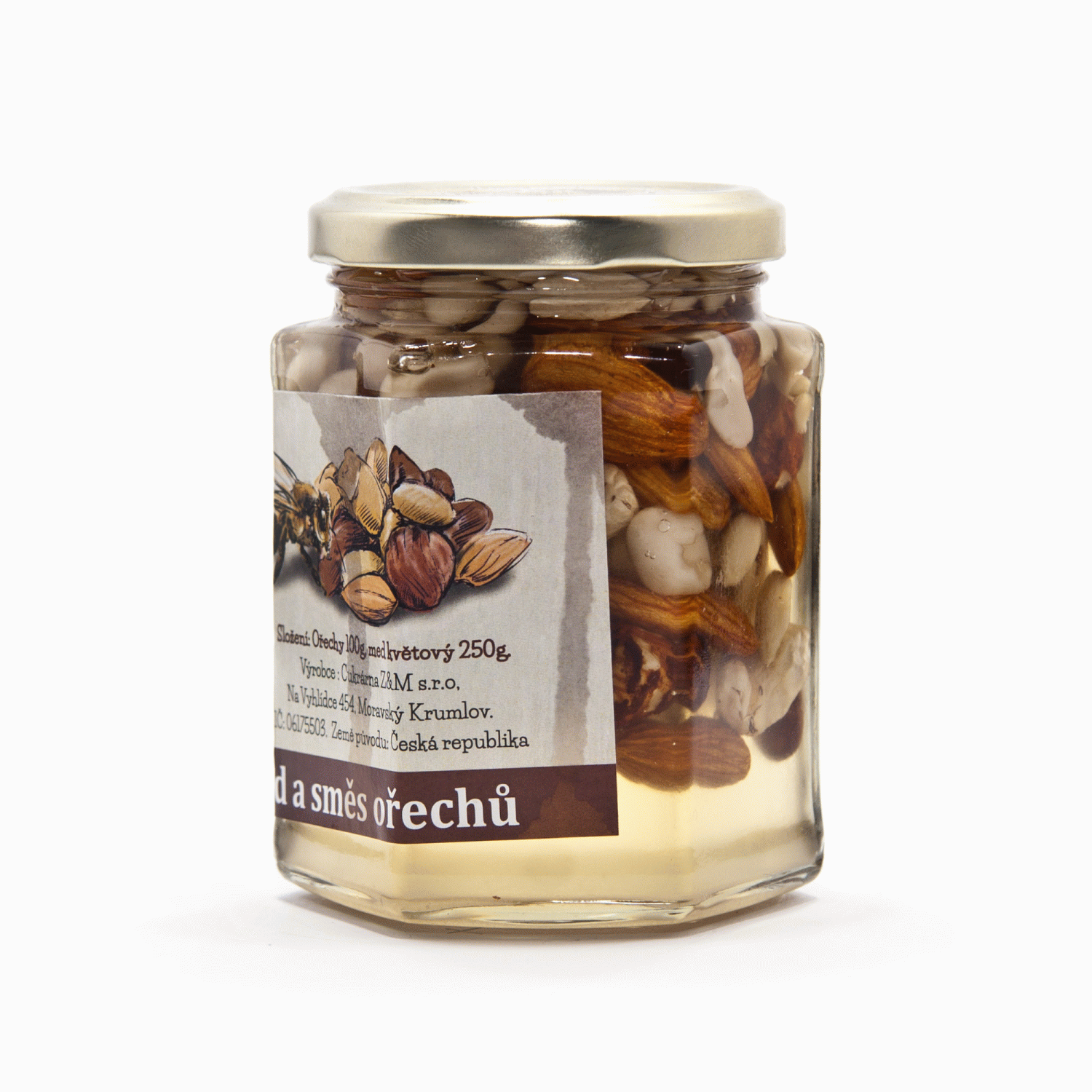Akátový med se směsi ořechů. Sladké křupavé oříšky s lahodným medem.