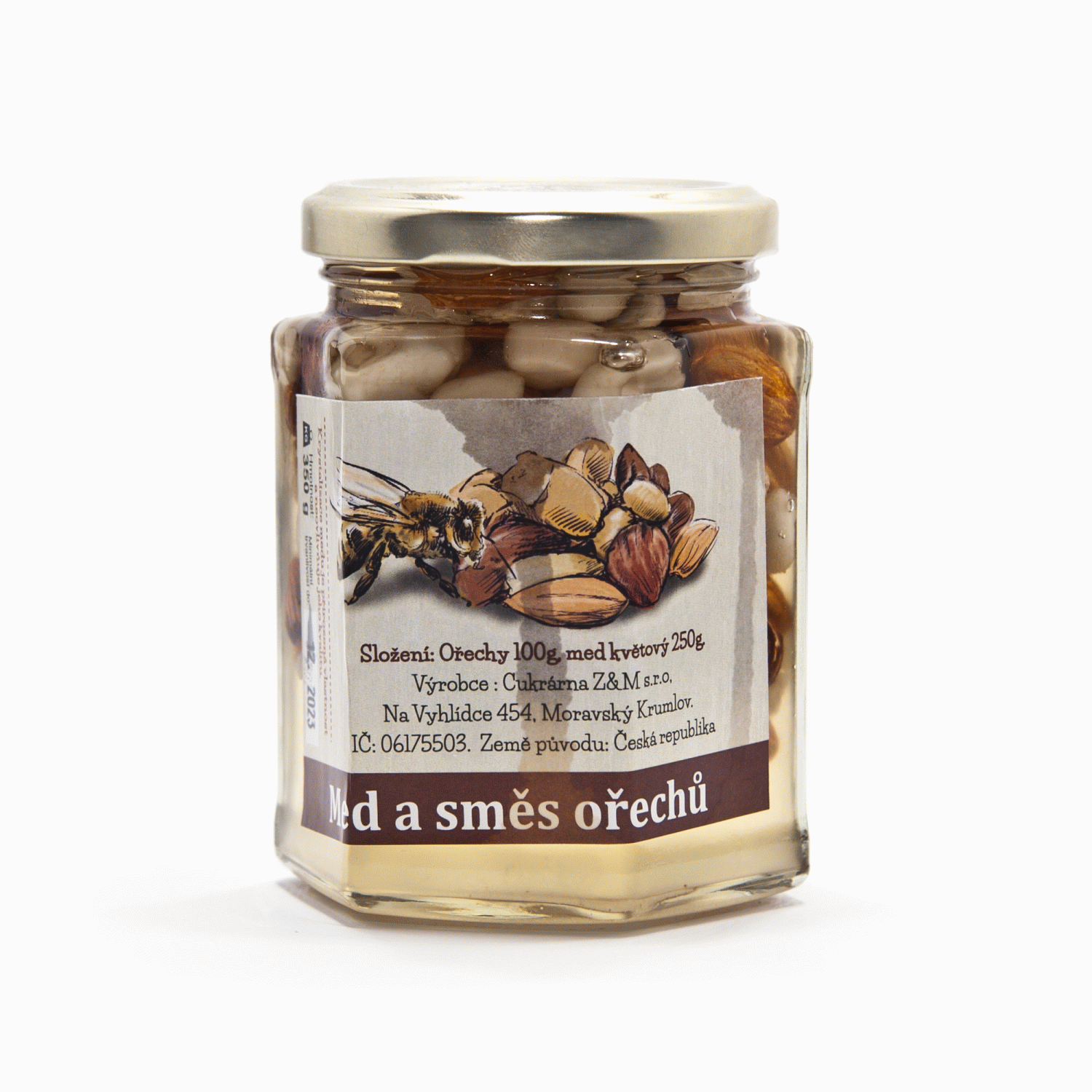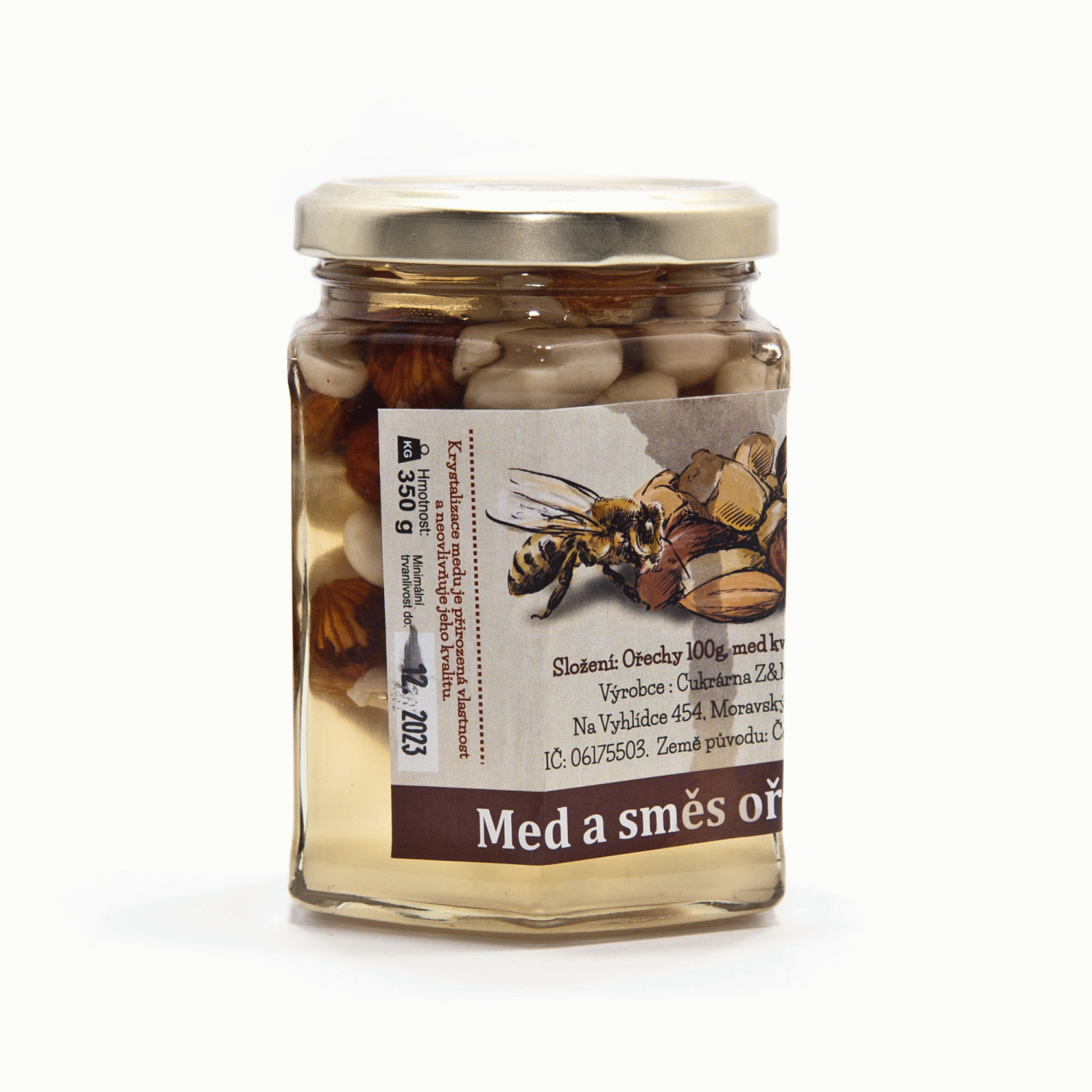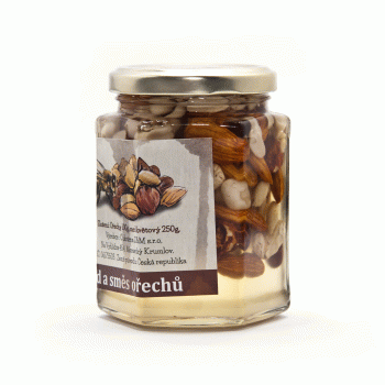 Akátový med se směsi ořechů. Sladké křupavé oříšky s lahodným medem. Skvělý na doplnění kaší a jogurtů nebo i samotný.