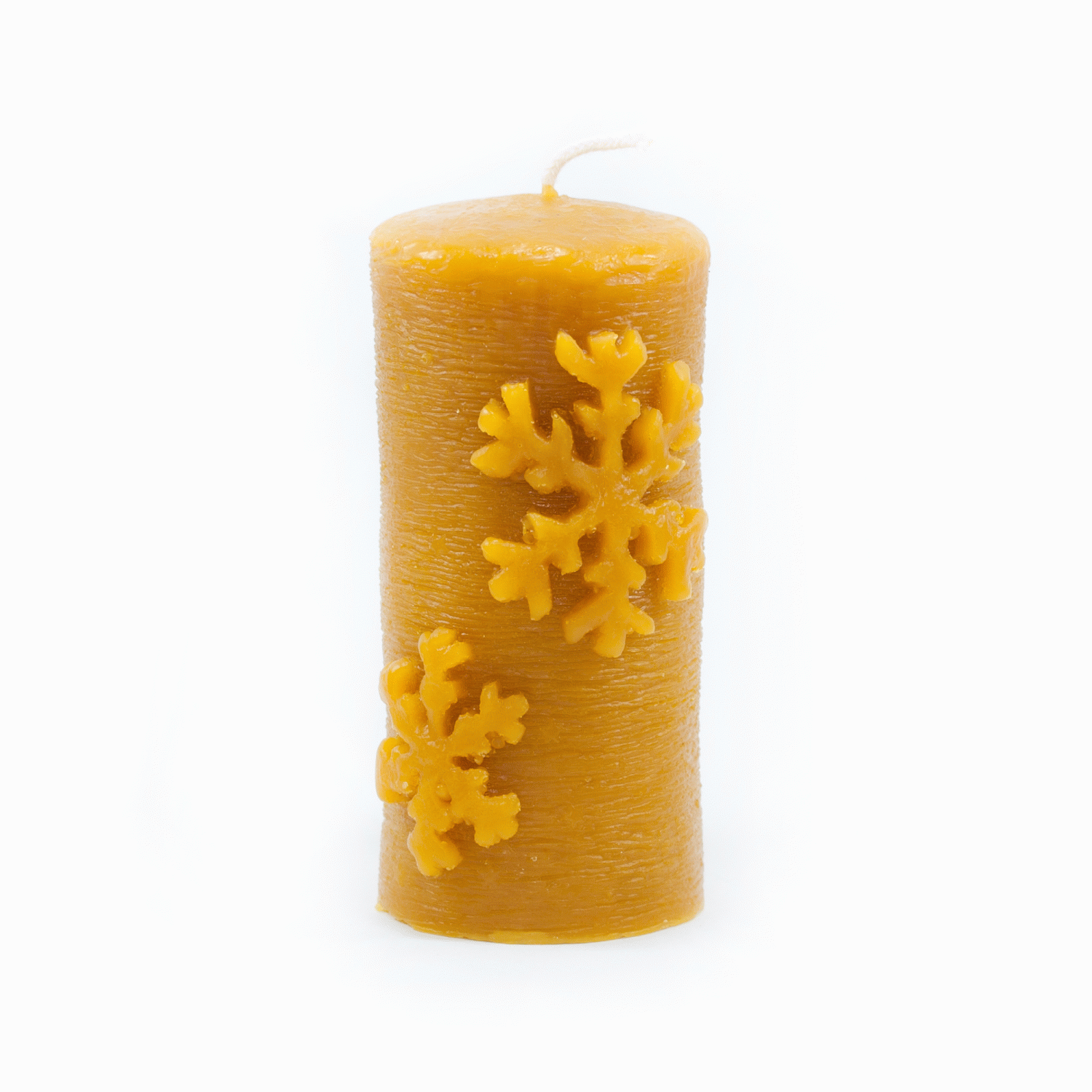 Svíčka ve tvaru válce zdobeného sněhovými vločkami, kterou sami ručně vyrábíme z našeho 100% včelího vosku. Ideální jako medový dárek pro vaše blízké, kamarády, partnery atd.